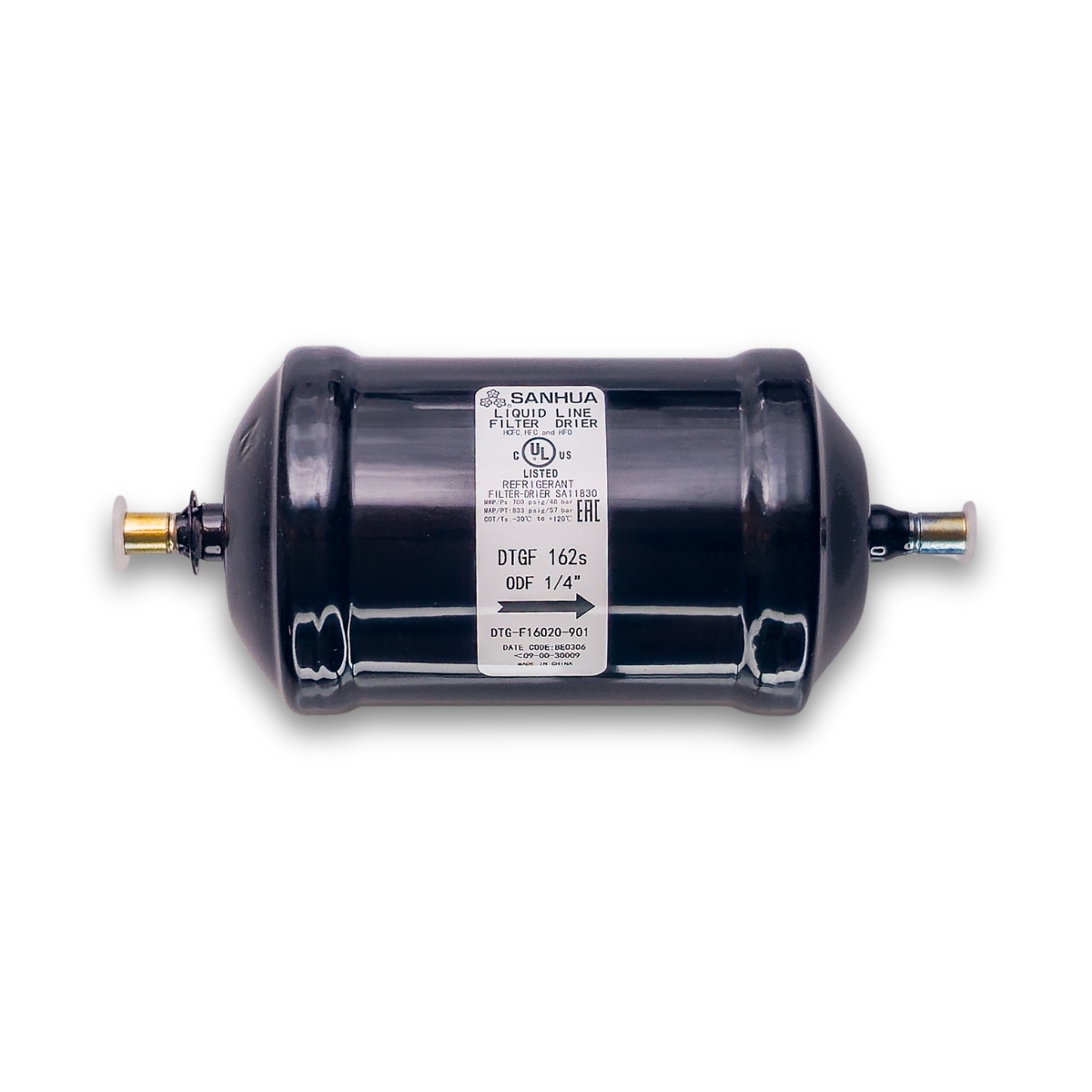 El filtro deshidratador Sanhua DTGE 162S ODF 1/4″ se utiliza en la línea de líquido de sistemas de refrigeración y aire acondicionado. Está diseñado para absorber humedad, ácidos y partículas sólidas en el refrigerante, garantizando la protección del compresor y la válvula de expansión. Este modelo cuenta con conexiones ODF de 1/4″ para soldar y un núcleo desecante de 16 in³, adecuado para sistemas residenciales y comerciales ligeros. Su cuerpo de acero con recubrimiento anticorrosivo ofrece resistencia y larga vida útil.