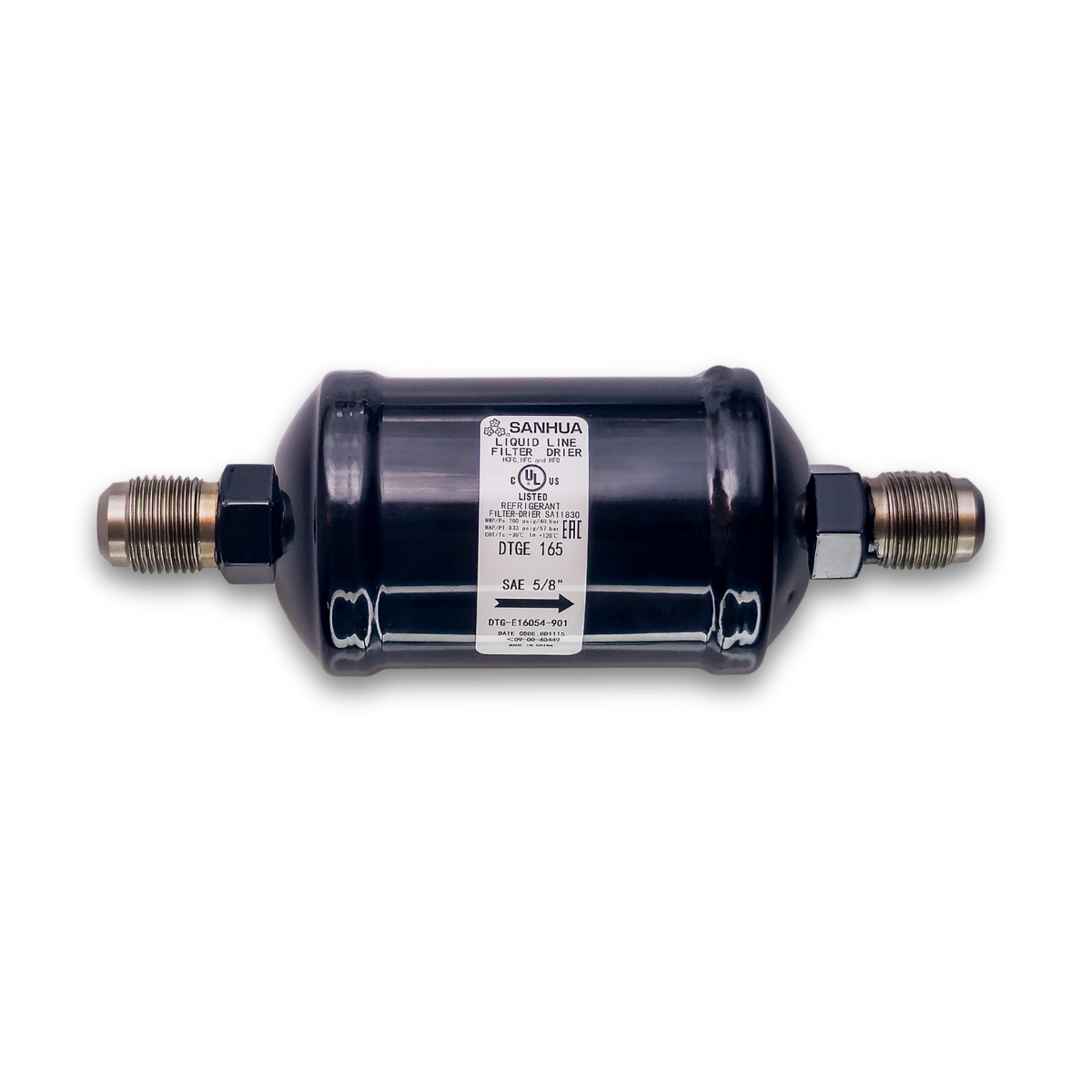 El filtro deshidratador Sanhua DTGE165 pertenece a la serie “Uni-Flow” de filtros para línea de líquido, diseñada para absorber humedad, ácidos y partículas sólidas presentes en el refrigerante, protegiendo el compresor y los componentes del sistema de refrigeración o aire acondicionado. Con un volumen interno de 16 in³ (~262 cm³) y conexiones de diámetro mayor (5/8″ en este caso del sufijo “165”), este modelo está pensado para aplicaciones de capacidad media-alta. Su construcción incorpora un núcleo sólido de desecante (100 % tamiz molecular 3Å) o híbrido (80 % 3Å + 20 % alúmina activada), acabado anticorrosivo con pintura resistente a spray salino y opciones de conexión por soldar u ODF o flare. Ofrece una alta eficiencia de filtrado (20 µm) y es compatible con refrigerantes tradicionales y modernos (HCFC, HFC, HFO).